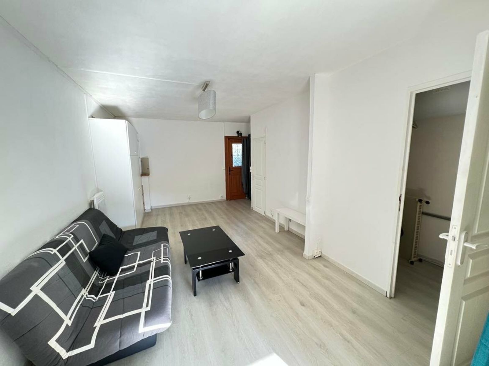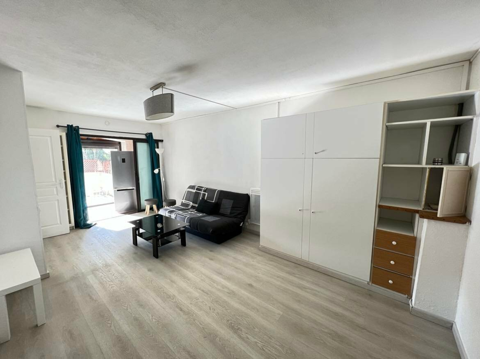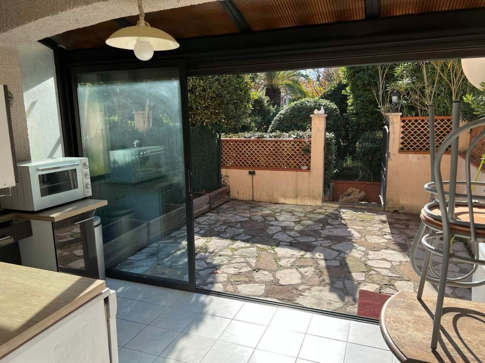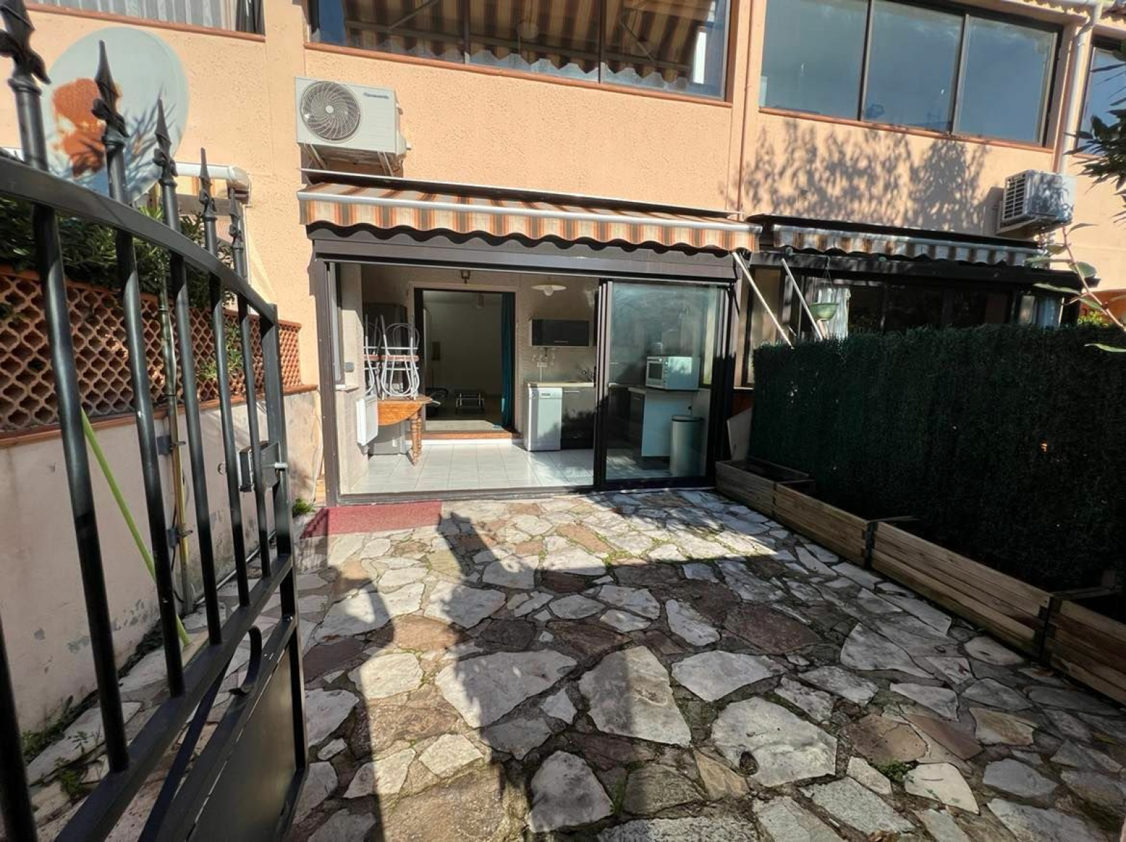 Au calme, dans petite résidence, studio en rez-de-jardin comprenant une entrée avec placard, un séjour, un cellier, une cuisine équipée dans loggia fermée, grande terrasse donnant sur le jardin de la copropriété. Parking privatif. Quote-part de charges annuelles : 1200 €. Copropriété de 26 logements.