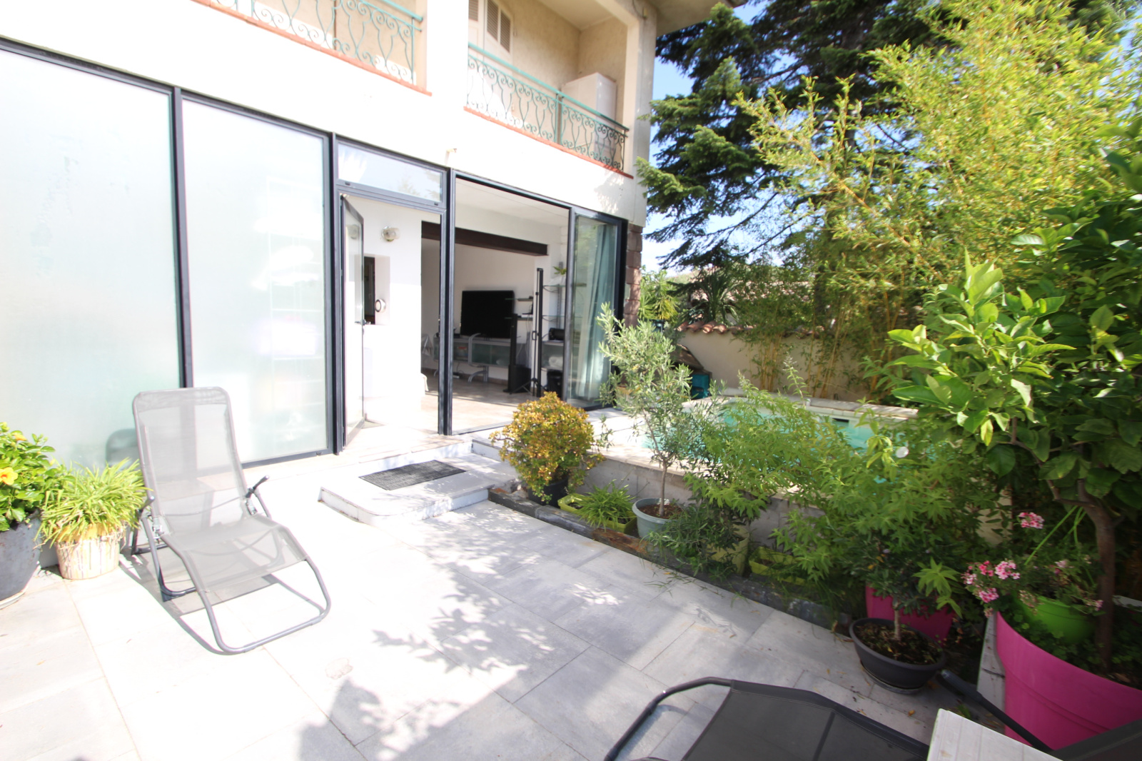 Proche du canal de PORT FREJUS, dans une copropriété de 3 lots, appartement en bas de villa 3 pièces de 83m² habitable (65m² loi carrez) comprenant une cuisine équipée sur séjour, deux chambres, un bureau, une salle d'eau avec WC, terrasse, piscine. Pas de charges.