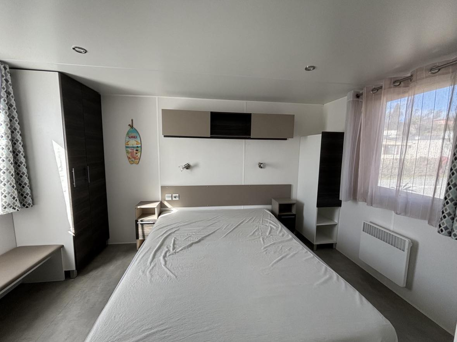 Séjour avec canapé convertible, cuisine américaine, une chambre avec lit double, une 2 éme chambre avec 2 lits 90, 2 salle d'eau, 2 wc, nombreux rangements.