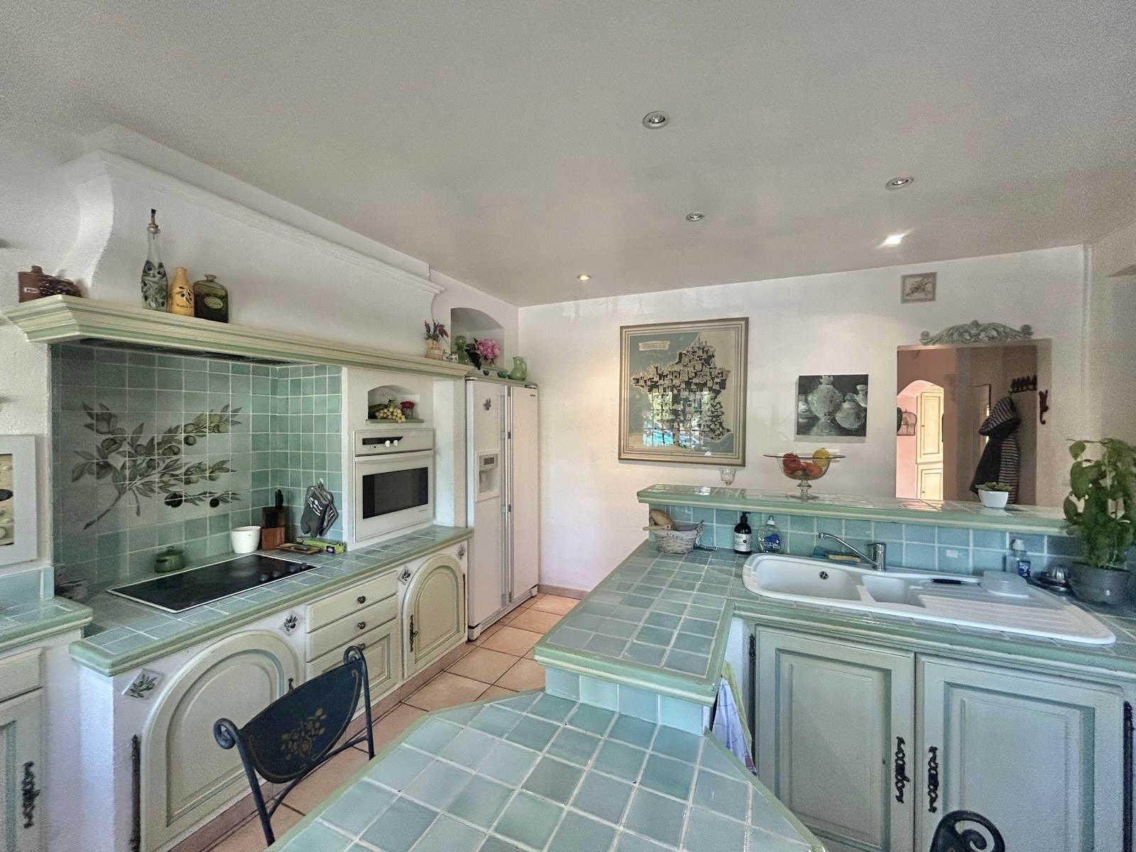 La villa principale s’ouvre sur une cuisine provençale indépendante, un séjour lumineux avec cheminée s’ouvrant sur une vaste terrasse orientée sud avec une vue dégagée sur la piscine (Diffazur 10 x 5 m en forme libre, et 2m60 au plus profond) et le Massif des Maures.