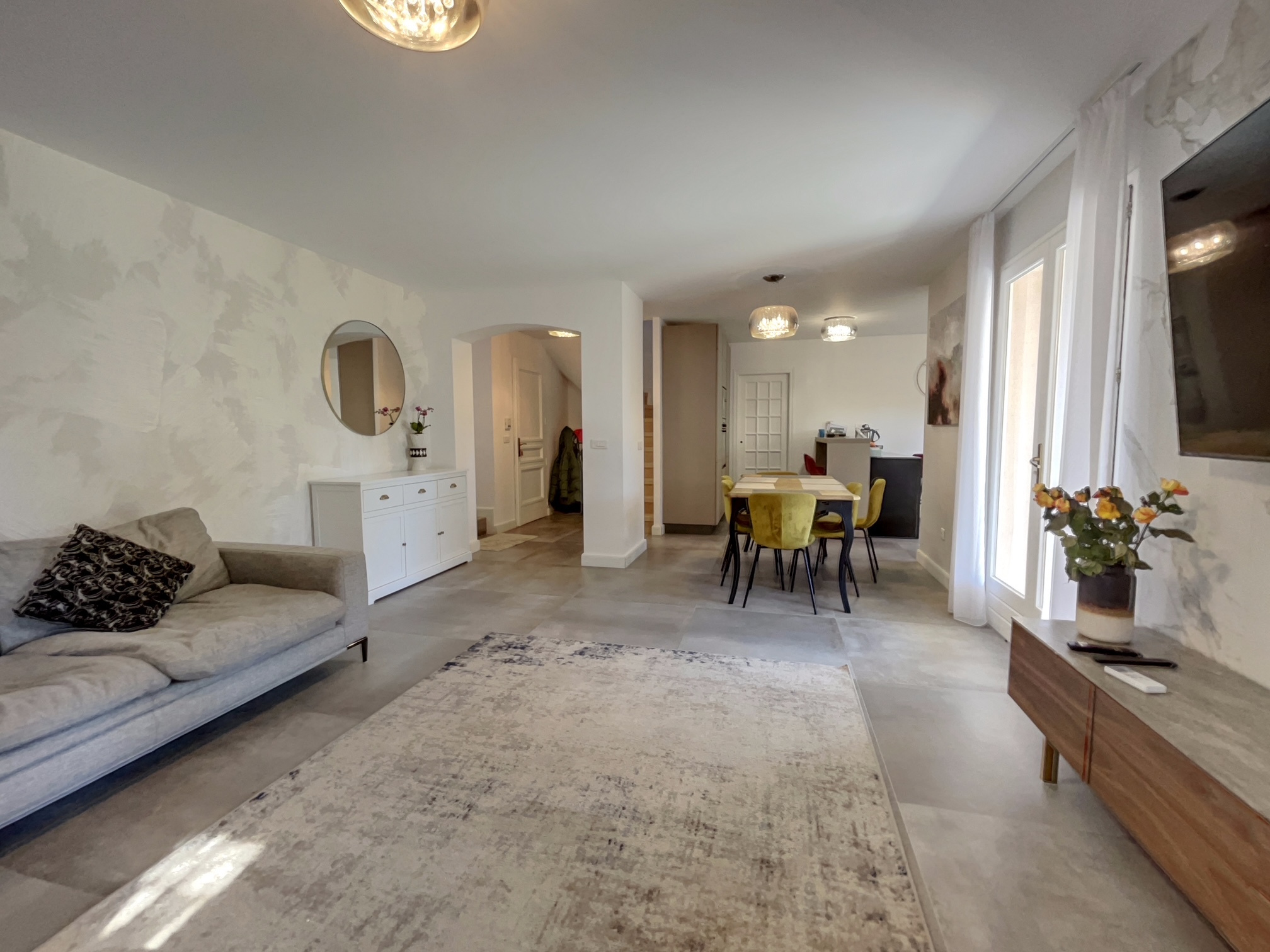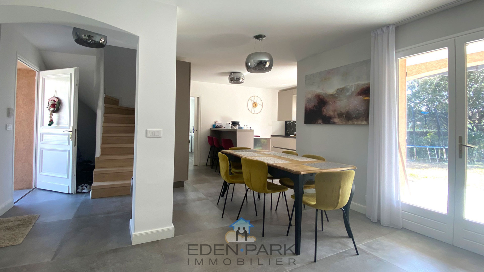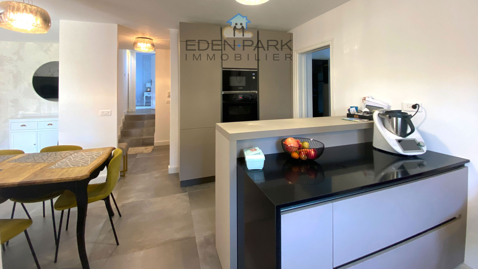 A l'intérieur, cette maison d’une surface habitable de 120 m² est répartie au RDC sur 4 pièces lumineuses : Une entrée, une cuisine ouverte de marque Veneta Cucine, un cellier, le salon/séjour avec sa cheminée s'ouvrant sur une terrasse avec la forêt en arrière plan et une magnifique suite parentale en demi niveau avec un WC supplémentaire indépendant.
