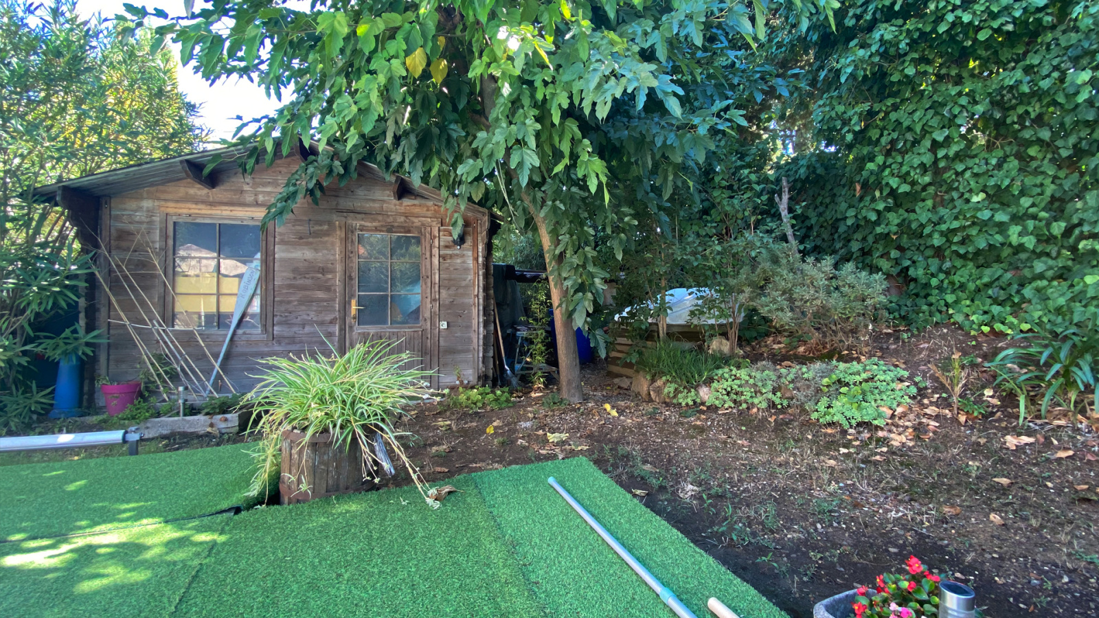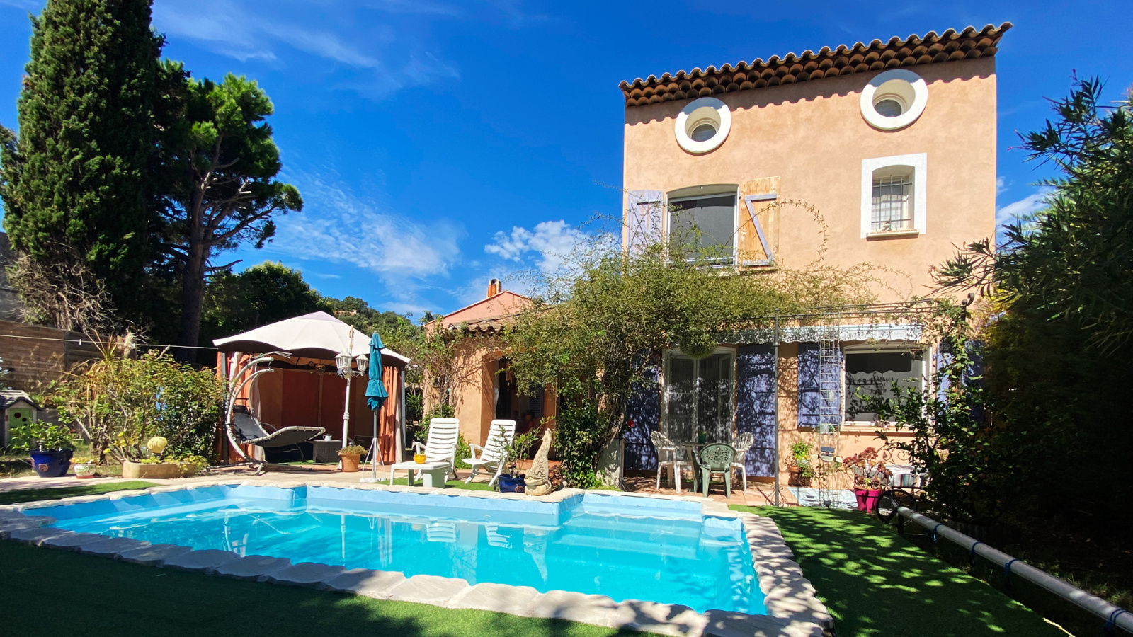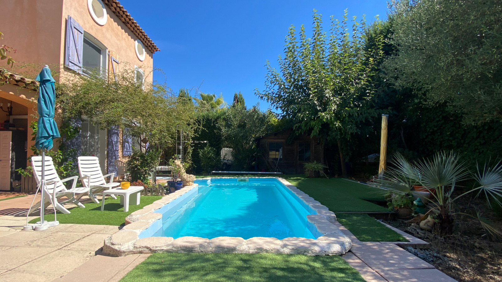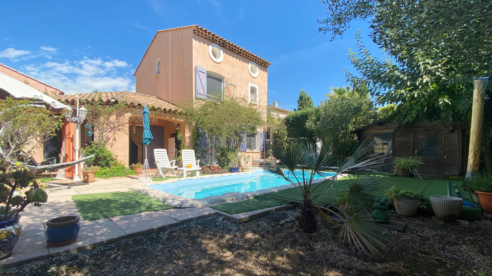 Le rez de jardin est composé d'une entrée avec placards, d'une cuisine équipée semi ouverte, d'un WC indépendant avec lave mains, d'une buanderie et d'un spacieux séjour salle à manger de 39m2 env. avec cheminée, baigné de lumière naturelle avec ses larges ouvertures sur les terrasses ombragées, la piscine et le jardin. Ces espaces prolongent l'intérieur vers l'extérieur clôturé, complété d'espèces méditerranéennes et en partie recouvert de gazon synthétique, demandant peu d'entretien.